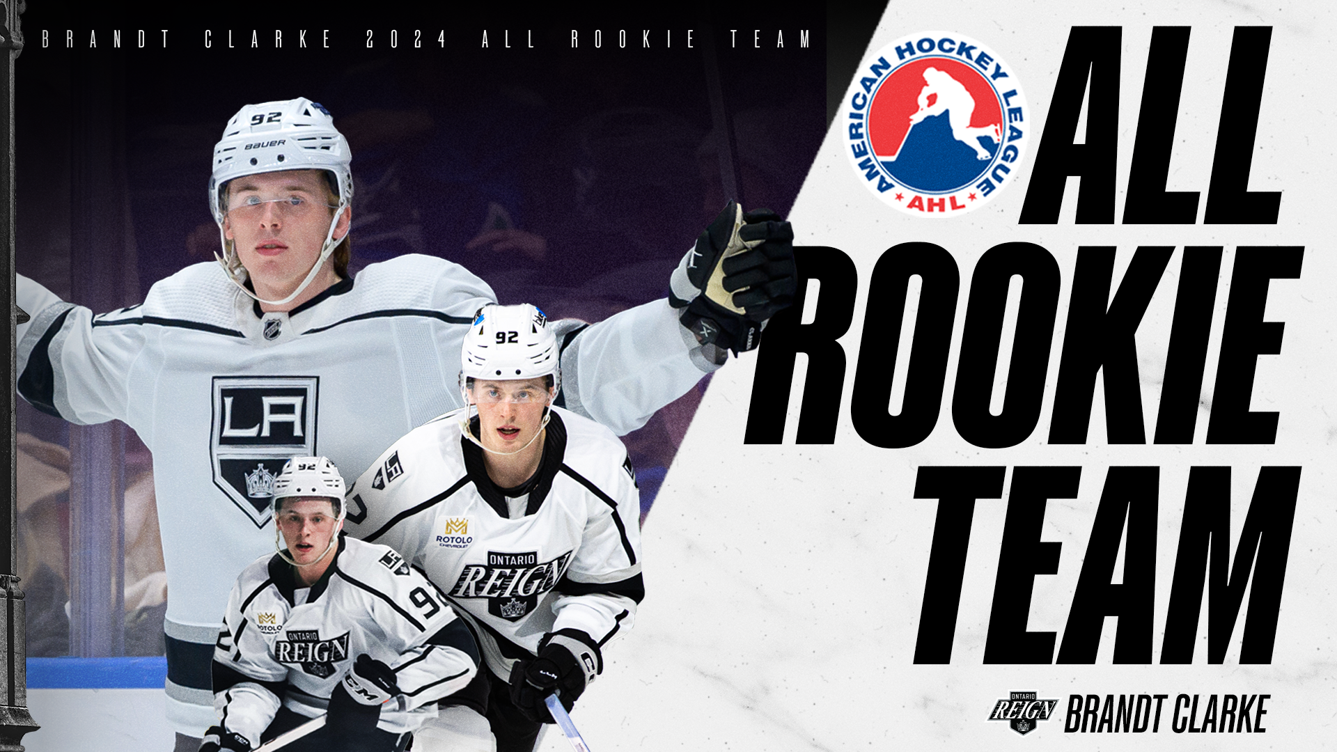 The American Hockey League announced today the selections for the league's 2023-24 All-Rookie Team, which includes Ontario Reign defenseman Brandt Clarke.